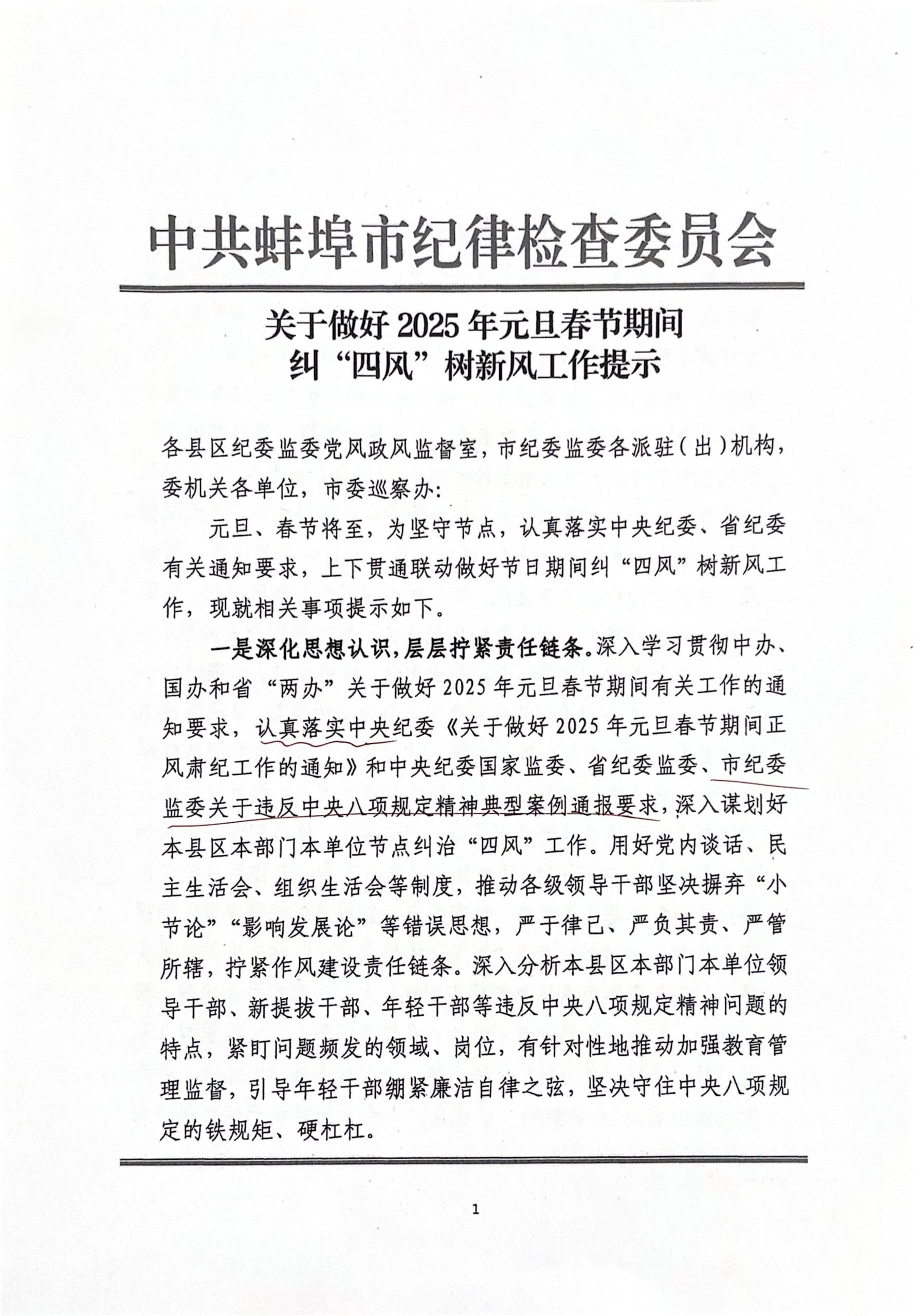 关于做好2025年元旦春节期间纠“四风”树新风工作提示