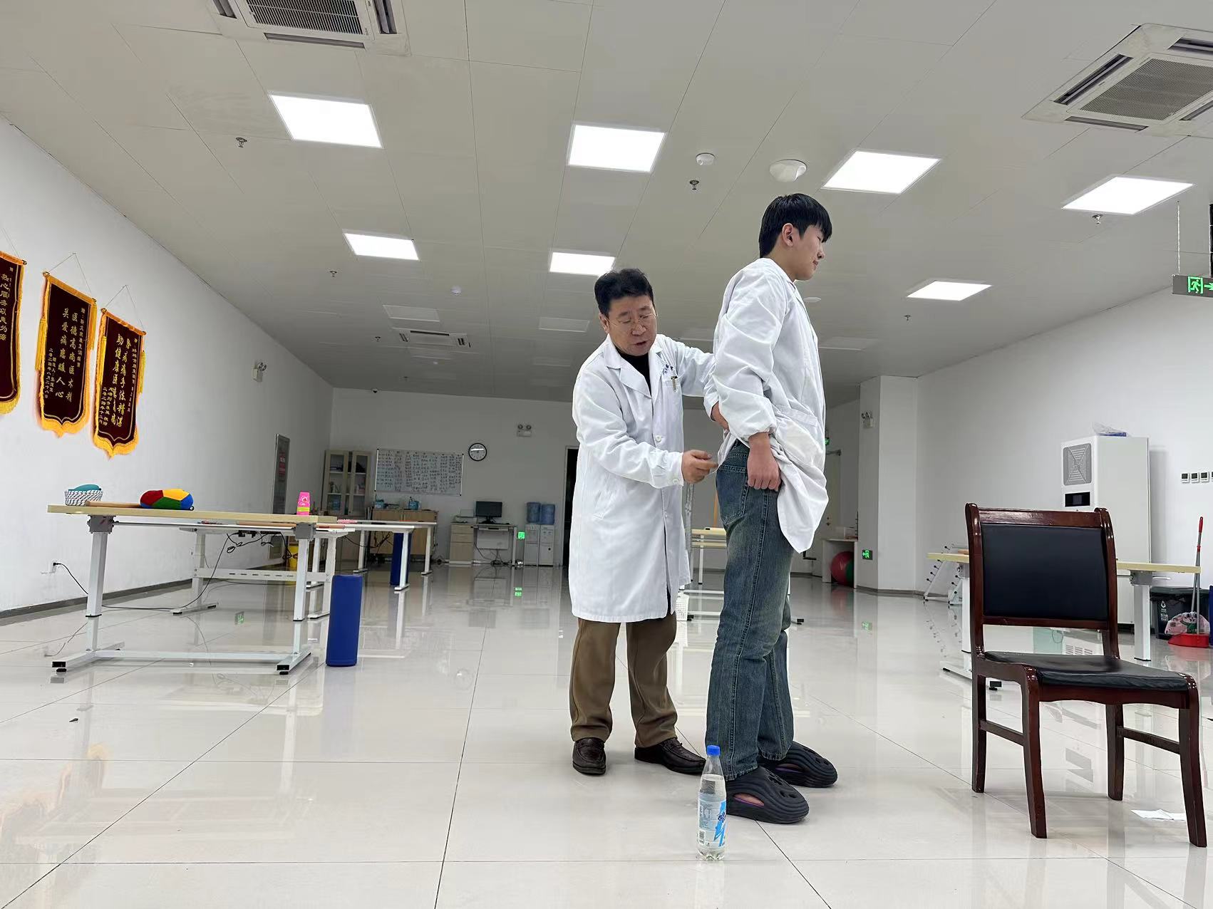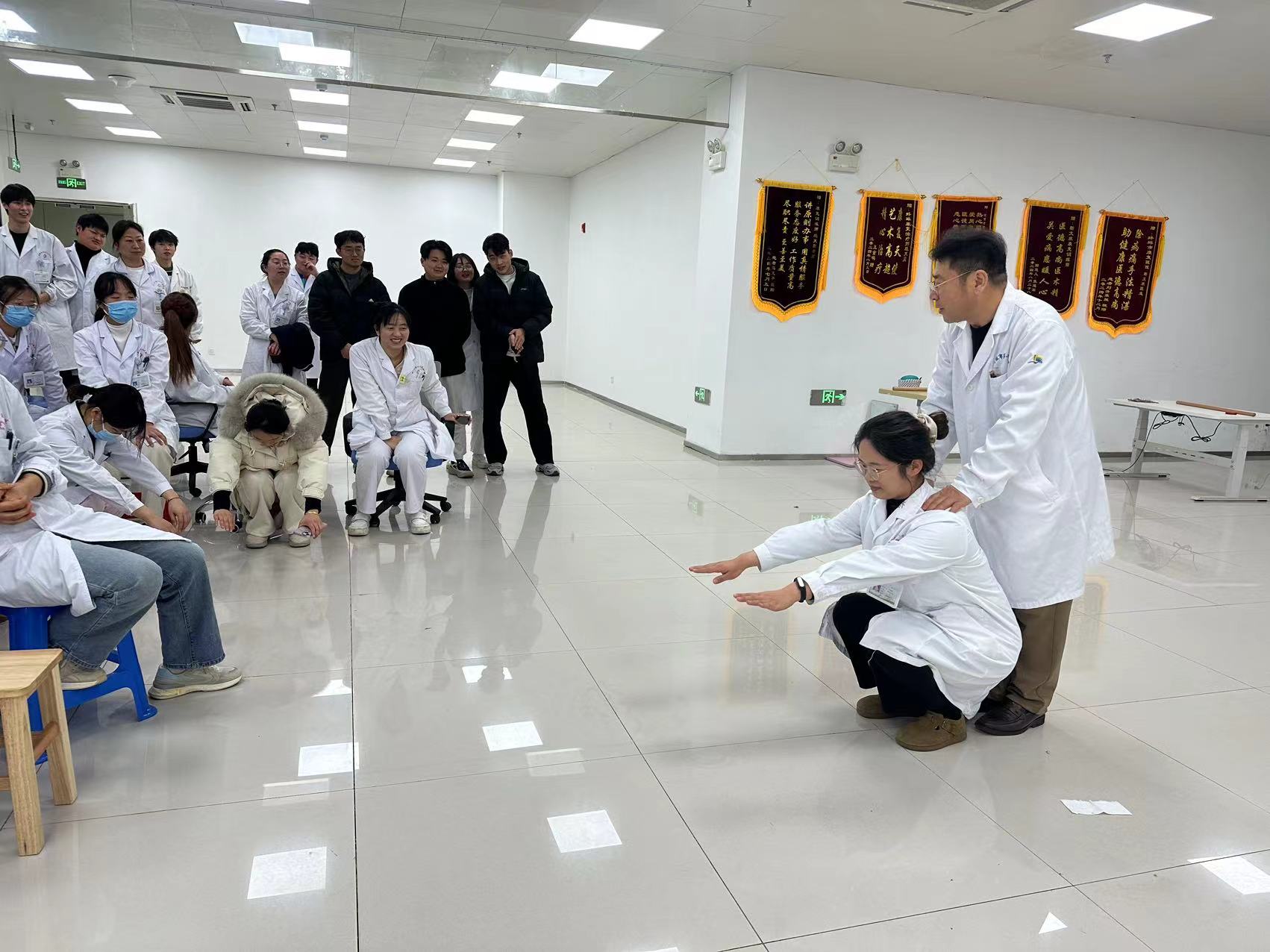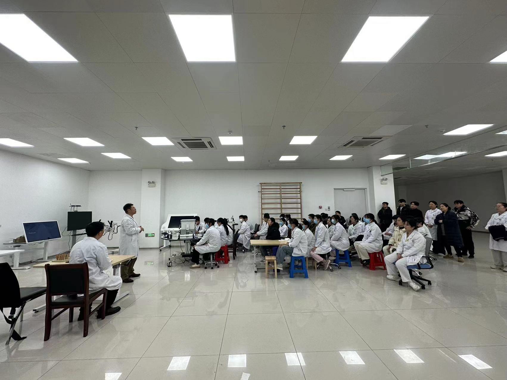 匆匆吃完午饭后,郭旭教授便即刻前往康复二厅,为全体治疗师开展业务培训,现场进行下肢康复评估指导的实践演示。在培训过程中,郭旭教授亲自为治疗师们展示如何进行系统的下肢康复评估。从基础的肢体形态观察,到关节活动度的精确测量,再到肌肉力量的专业测试。他强调,精准的评估是制定有效康复方案的基石,只有全面且细致地了解患者的身体状况,才能为后续的康复治疗指明方向。