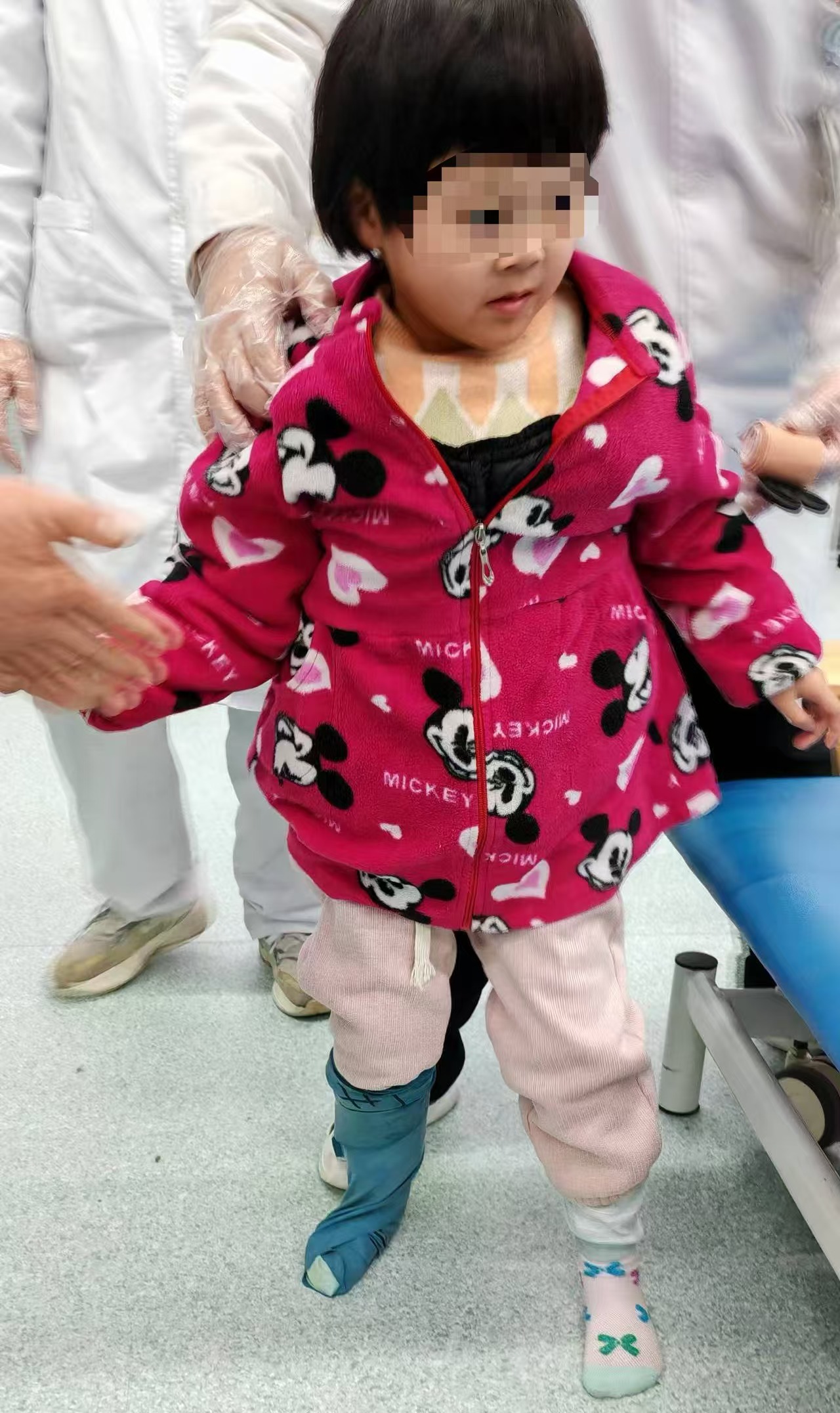 郭旭教授在PT大厅对该患儿运动功能进行了仔细评估。经检查,指出患儿存在患侧髋关节外展外旋,足外翻,行走时前脚掌着地等问题。针对这些情况,郭旭教授指导治疗师重点松解骶髂关节周围肌肉,牵伸患足跟腱,加强患侧内收肌、胫骨后肌肌力,提高患儿跪位平衡能力、单腿支撑能力。同时,指导患儿家属使用弹力绷带来改善足部畸形,矫正异常步态,为患儿家庭康复训练提供了科学指引。