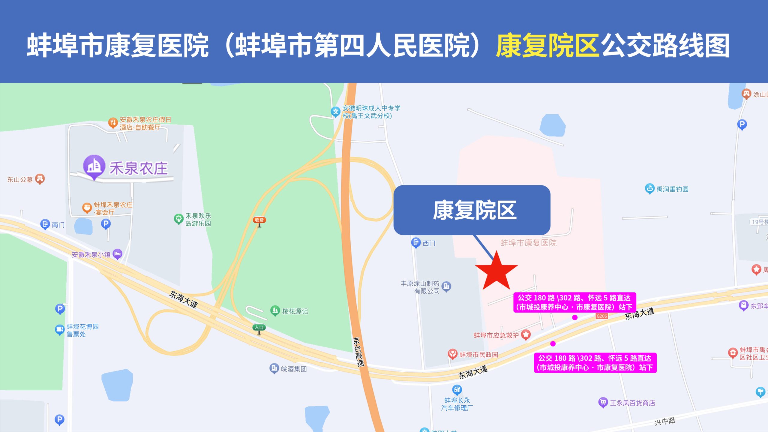公交路线:180路、K311/302、怀远5路直达市城投康养中心·蚌埠市康复医院(原四院)。