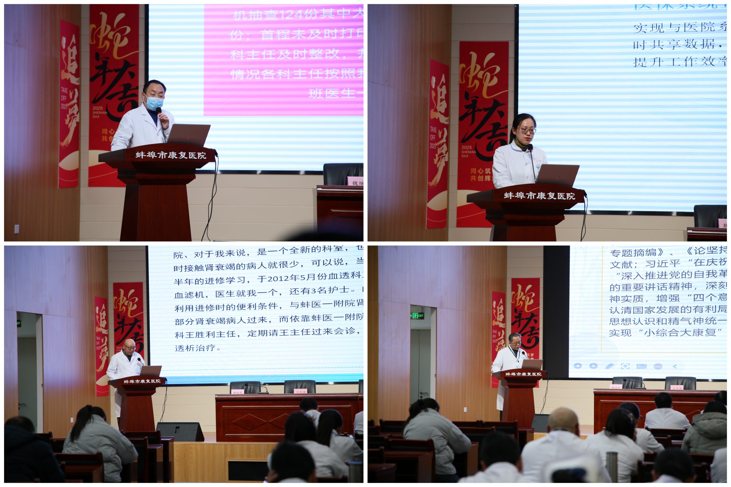 会上,医教科、财务科、医保办等重点职能部门逐一汇报了医院2024年的运行情况及近期重点工作安排。临床科室代表——影像中心主任刘浩、血透中心主任耿春才,对科室2024年工作进行经验交流与分享,并介绍了2025年工作规划。随后,各分管领导针对汇报内容进行了精准点评,并作出了重要部署。