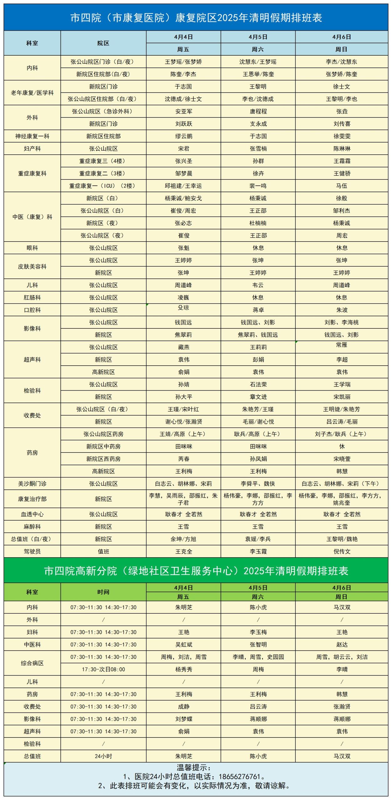 蚌埠市第四人民医院(市康复医院)2025年清明假期期间(4月4日—4月6日)执行无假日门诊,各科室门诊、专家门诊正常应诊,药房、医技等窗口科室正常开放。医院开设急诊24小时绿色通道,急诊科正常排班。