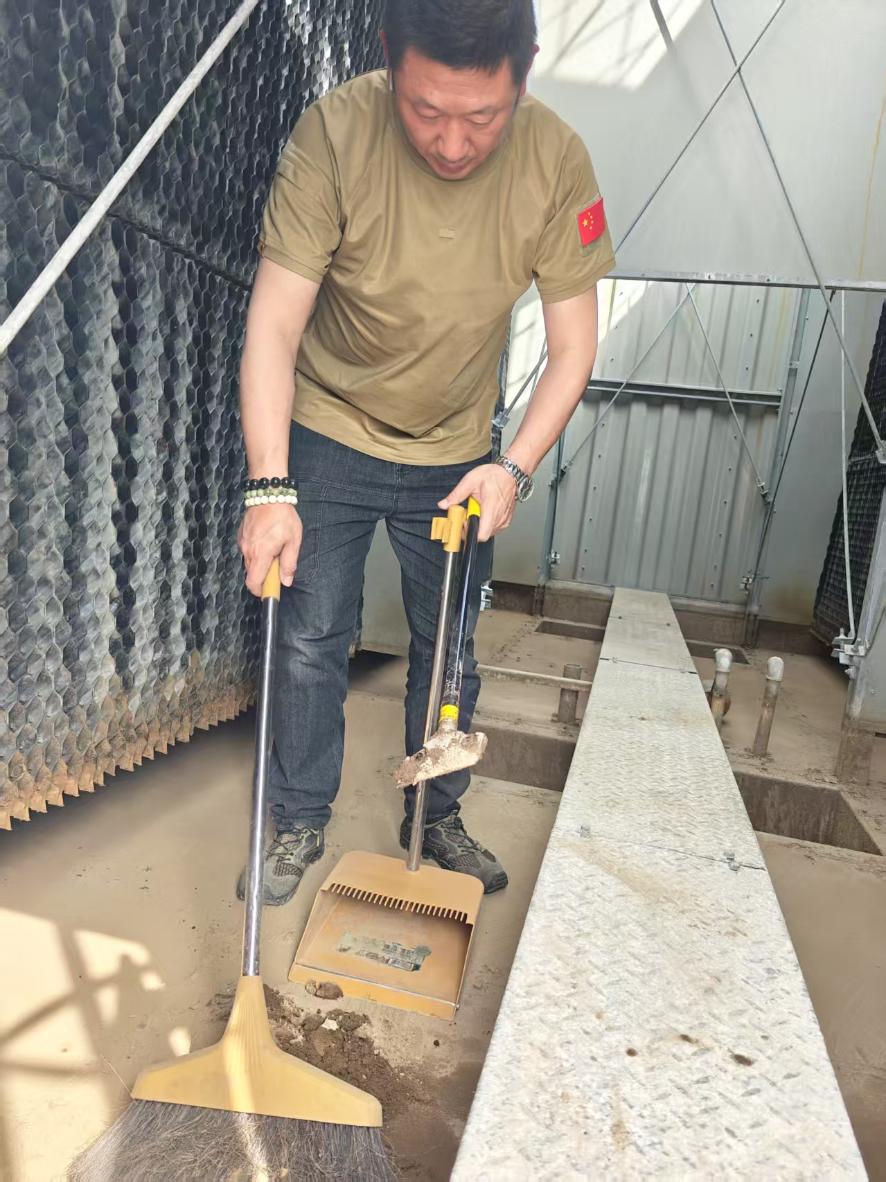 在清洗过程中,后勤工作人员严格按照规范流程操作。首先使用铲子细致铲除冷却塔内沉积的污泥,随后用扫帚进行全面清扫,单座冷却塔清理出的污泥堆积如山。紧接着,工作人员采用高压水枪对塔体内部进行深度冲洗,重点针对塔壁、塔底等易积垢部位,全力清除表面污垢与杂物;针对顽固污渍,使用专用刷子谨慎刷洗,在彻底清洁的同时有效避免损伤塔体。经过后勤工作人员的不懈努力,一个干净整洁的冷却塔集水池呈现在参与清扫工作人员的面前。