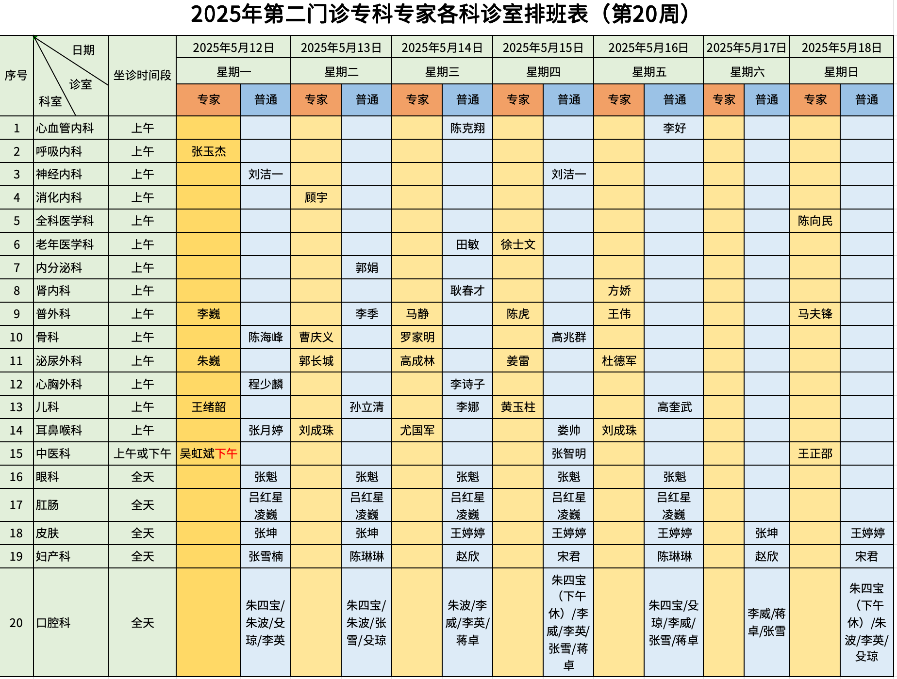 具体门诊排班如下: