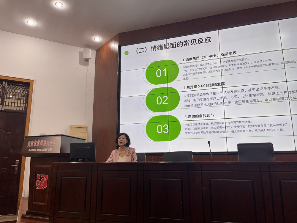 为帮助高三学子科学调适备考心态,缓解考前焦虑情绪,以积极昂扬的状态迎接高考,5月14日,蚌埠市第四人民医院(市康复医院)体检中心应邀走进蚌埠第九中学,为高三学生开展了一场主题为“缓解考前焦虑从容迎接高考”专题心理知识讲座,为即将奔赴考场的学子送上“缓解焦虑的心理处方”。