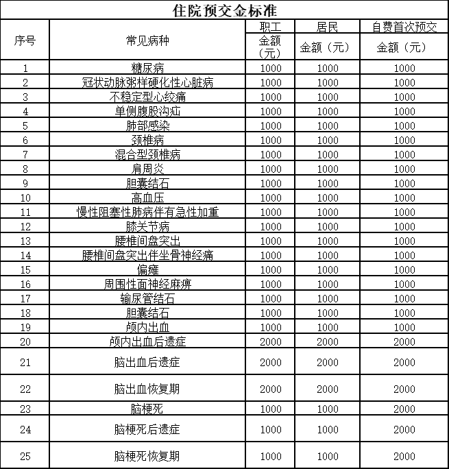 1、上表仅列出我院当前常见病种的住院预交金标准,未列出的病种疾患可先预缴1000元,如有不足请补缴,实际住院费用以出院结算为准,多退少补。