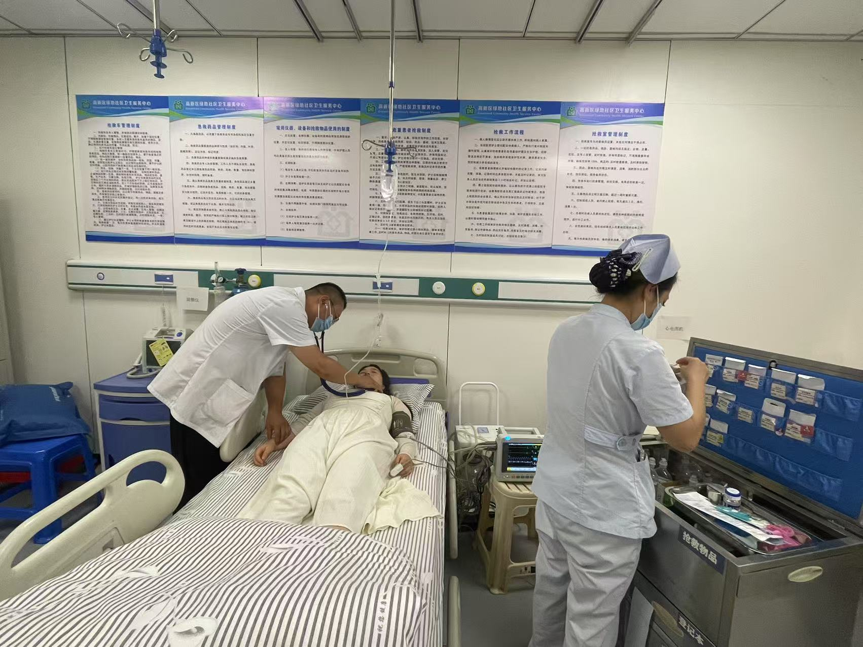 接到报告后,医护人员迅速抵达现场,同步开展抢救工作:实时监测生命体征、快速建立静脉通路、遵医嘱精准用药,同时立即开放气道、给予吸氧以维持呼吸道通畅,整个抢救过程紧张有序、配合默契。