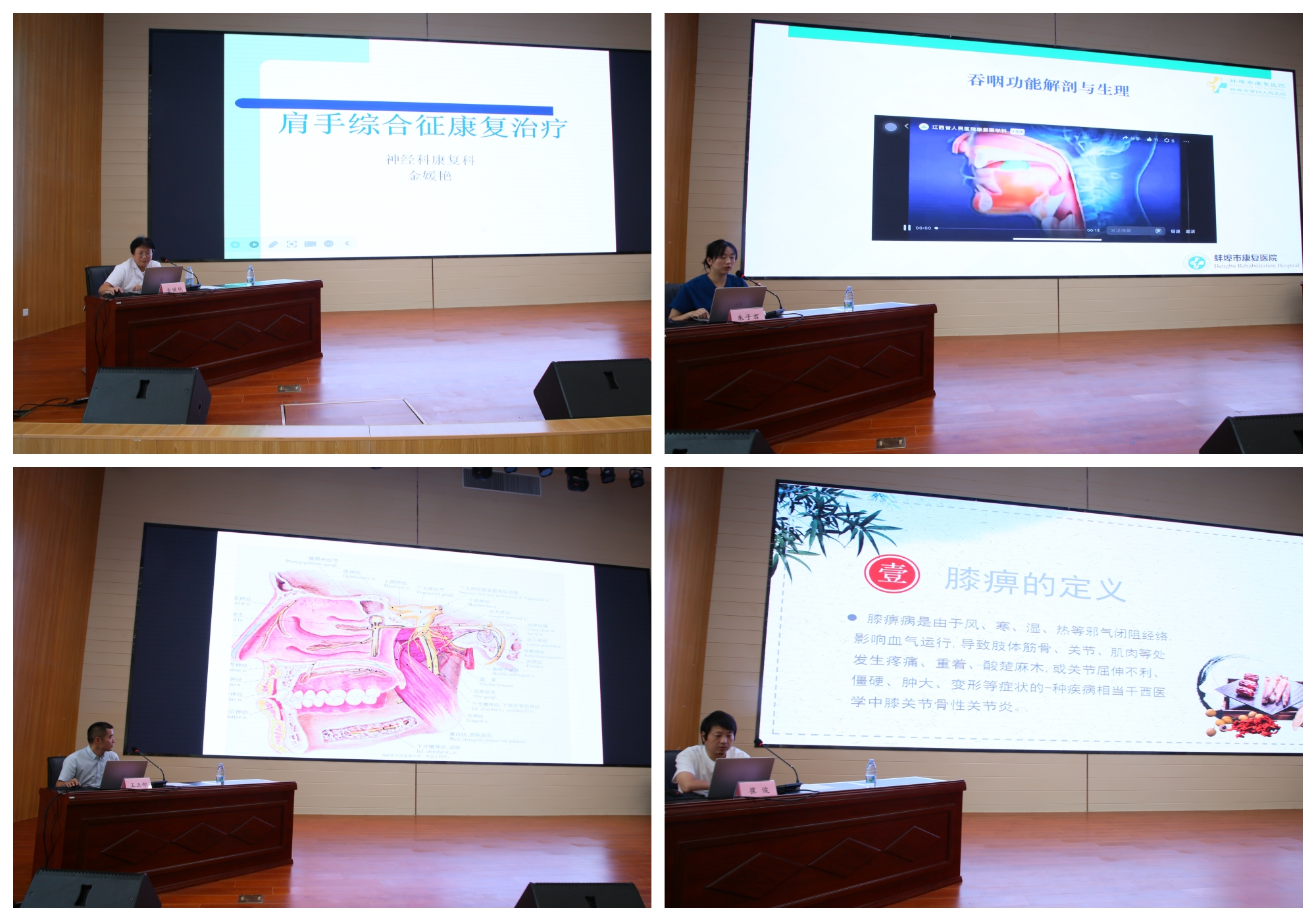下午场同样精彩:蚌埠市康复医院(市四院)中医科一病区主任王正邵探讨“面神经麻痹的康复治疗”,分享最新康复治疗方案;蚌埠市康复医院(市四院)中医科一病区副主任中医师崔俊毫无保留地传授“膝关节病的针灸中药治疗经验”,展示中医特色疗法在膝关节病治疗中的优势;蚌埠市康复医院(市四院)神经骨关节康复科主任金媛艳讲解“肩手综合症康复治疗”,为学员提供肩手综合症康复思路与方法;蚌埠市康复医院(市四院)康复治疗部言语吞咽与认知障碍治疗科负责人朱子君介绍“吞咽障碍的干预措施——球囊扩张术”,细致讲解该技术操作要点与临床应用;蚌埠市康复医院(市四院)康复治疗部康复评定科负责人邱悦铭带来“脑卒中的入院评估体会”,分享脑卒中入院评估实践心得,为康复治疗前期评估提供参考。