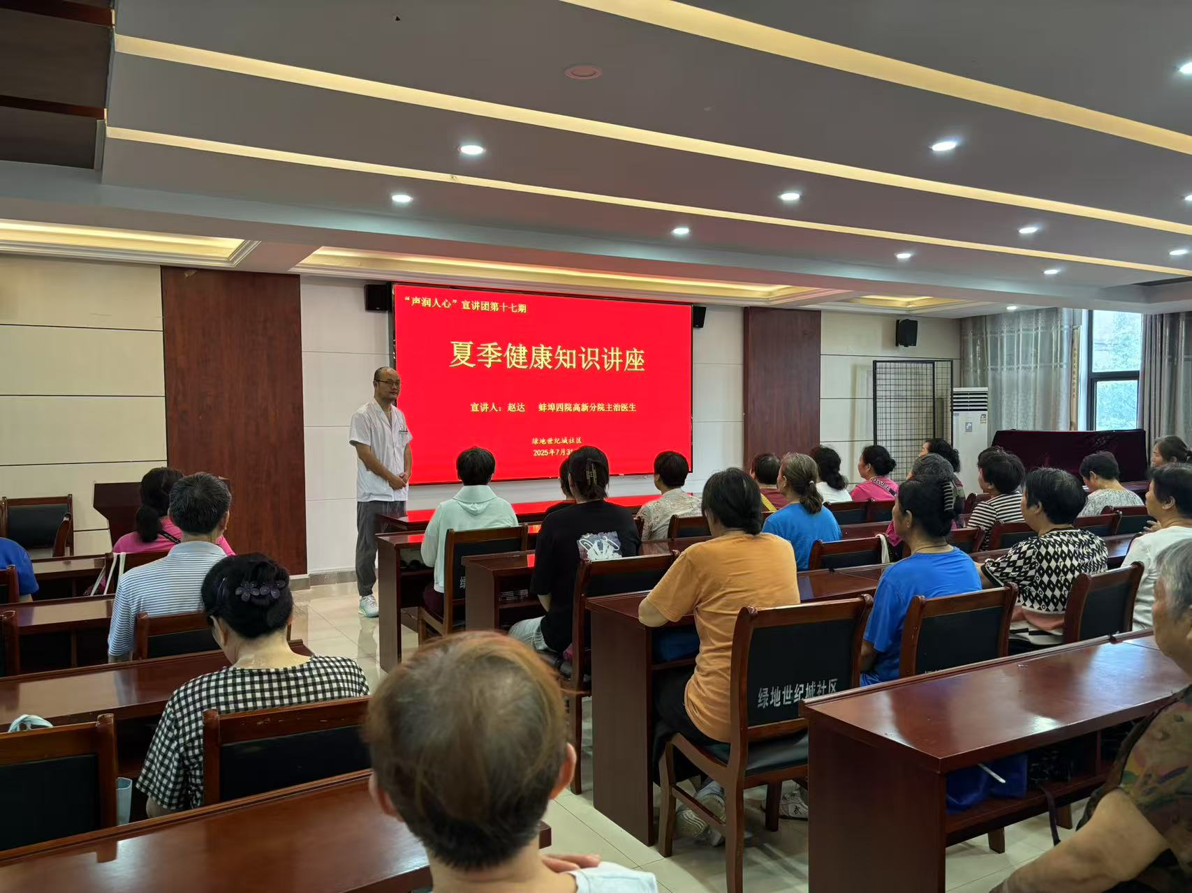 为发扬敬老爱老的传统美德,让社区老人感受到社区的关爱,7月31日上午9点,绿地社区卫生服务中心(蚌埠四院高新分院)虹斌工作室联合绿地社区为辖区内老年朋友开展“中暑的预防与急救”健康知识讲座。本次讲座吸引了40名社区老人到场参加。