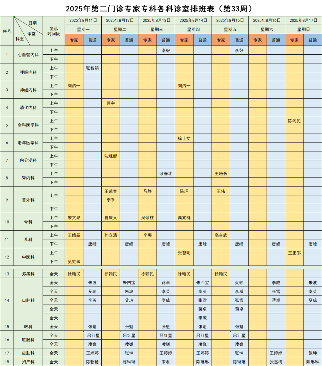具体门诊排班如下: