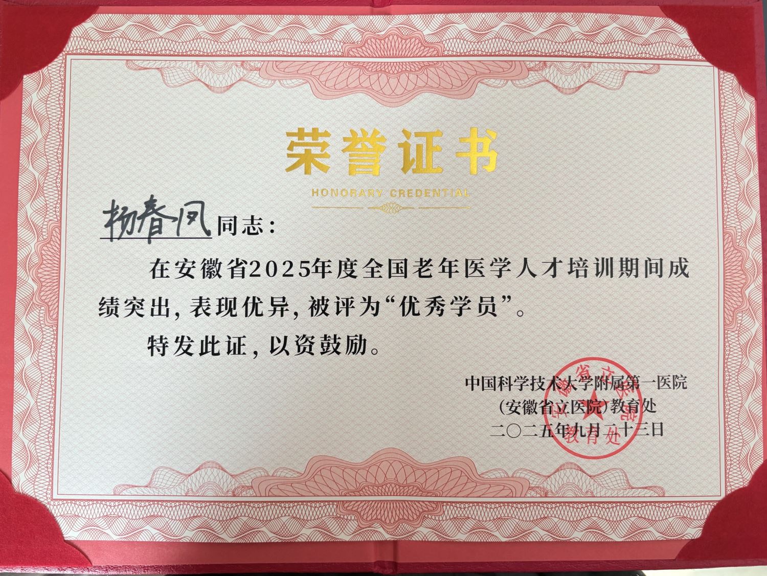 2025年9月23日,从中国科学技术大学附属第一医院(安徽省立医院)传来喜讯:我院选派的护理人员杨春凤在2025年度全国老年医学(护理)人才培训期间成绩突出、表现优异,荣获“优秀学员”称号。