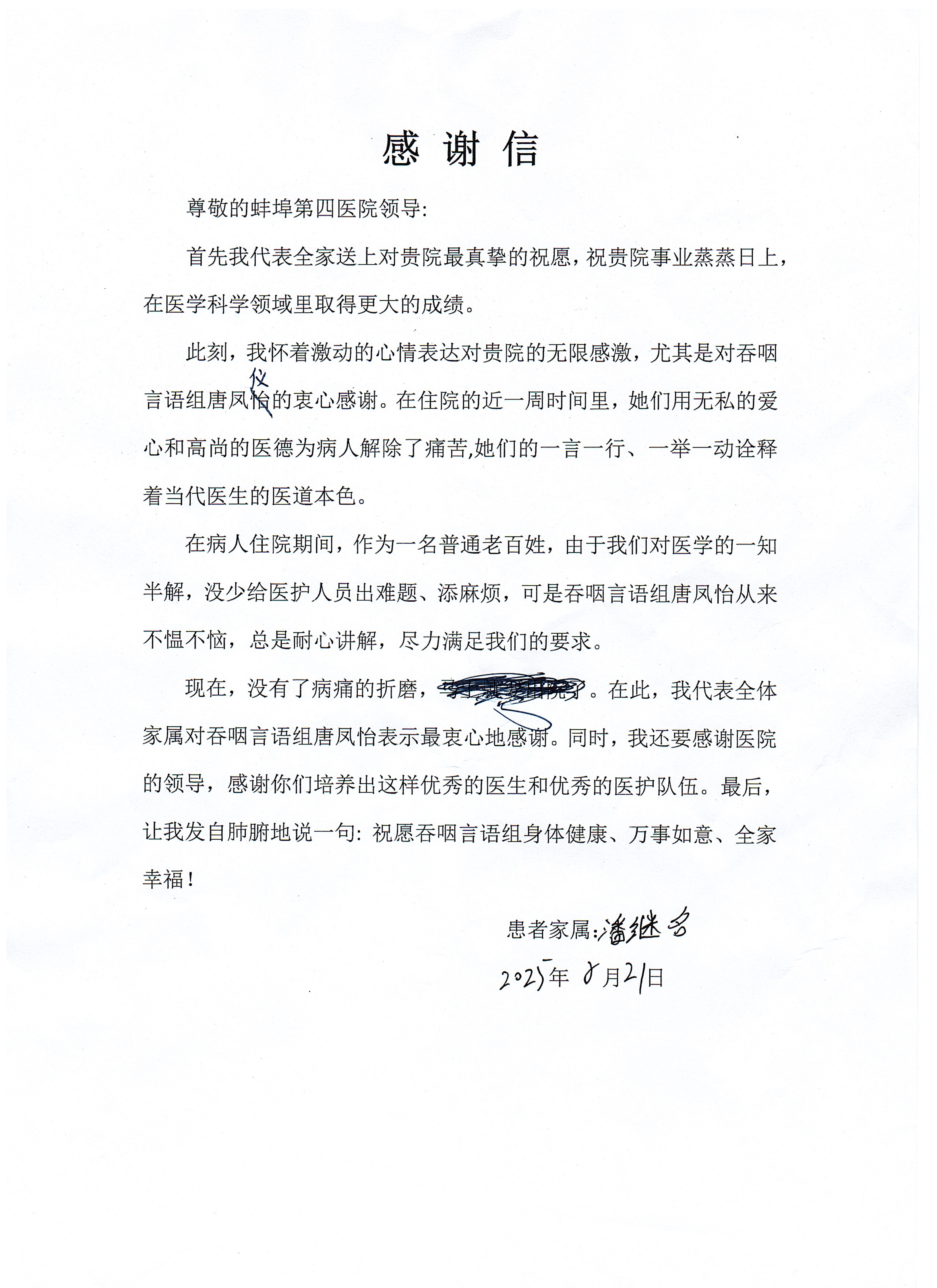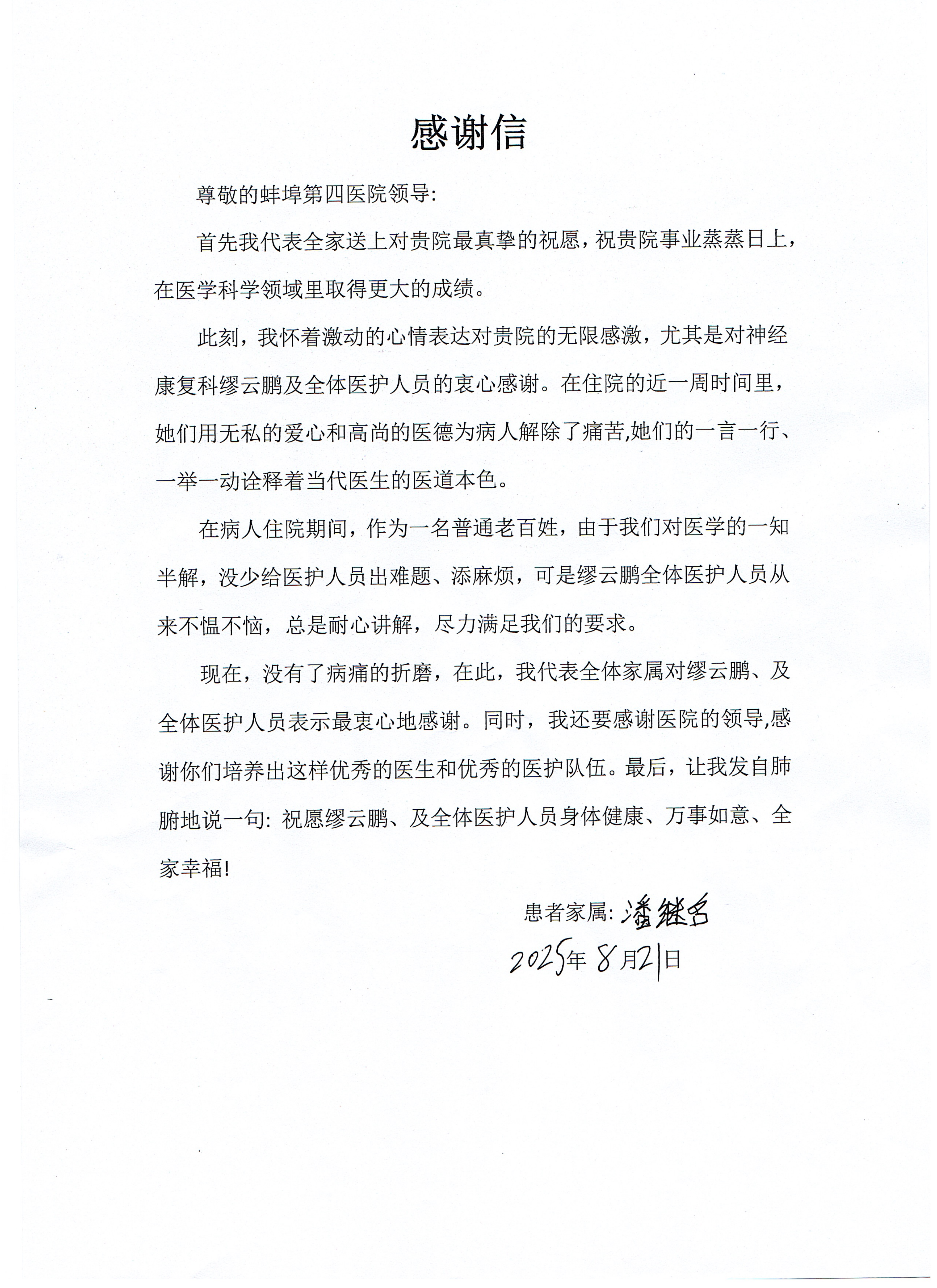 一直以来,蚌埠市第四人民医院(市康复医院)神经康复科始终秉持“以患者为中心”的服务理念,在提升医疗技术水平的同时,持续打造有温度的医疗服务。此次收到的三封感谢信,既是患者及家属对医护人员工作的高度认可,也进一步彰显了医院和谐融洽的医患关系。