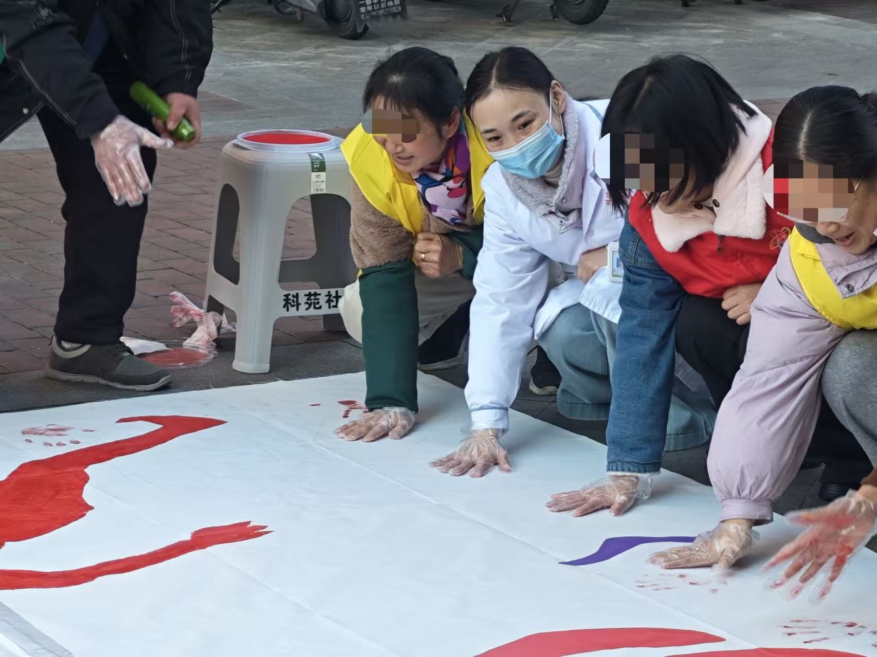 “掌心相印,就是我们对社区的心意!”12月3日的科苑社区广场上,暖冬的阳光裹着欢声笑语,蚌埠市第四人民医院女性康美中心的医护人员与社区志愿者、居民们围站在巨幅画布旁,将蘸满颜料的手掌印在“汇聚志愿力量·共建美好社区”的标语边——这抹鲜活的红,成了冬日里最暖的邻里符号。