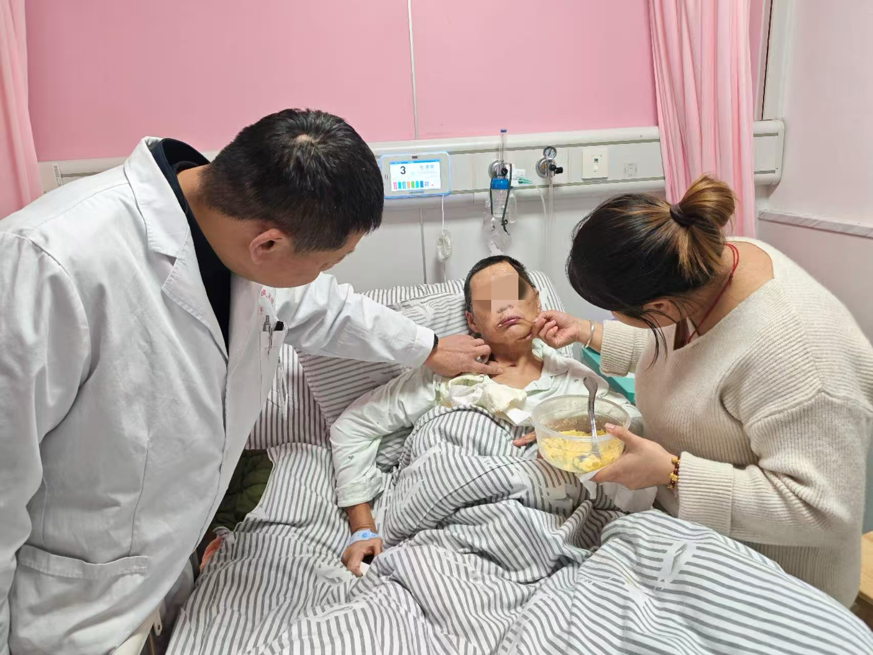 在吞咽功能重建领域,康复治疗部语言吞咽治疗师每日为患者开展系统训练,从口颜面肌肉刺激、冰刺激到门德尔松手法,逐步激活吞咽反射,实现从口部运动到安全吞咽的过渡;中医针灸科则精准选取廉泉、风池、金津、玉液等穴位针刺,调和气血、利咽通窍,改善咽部肌肉敏感性与协调性。双重干预下,患者吞咽功能快速恢复,入院第7天成功拔除胃管,顺利实现经口自主进食,迈出康复第一步。