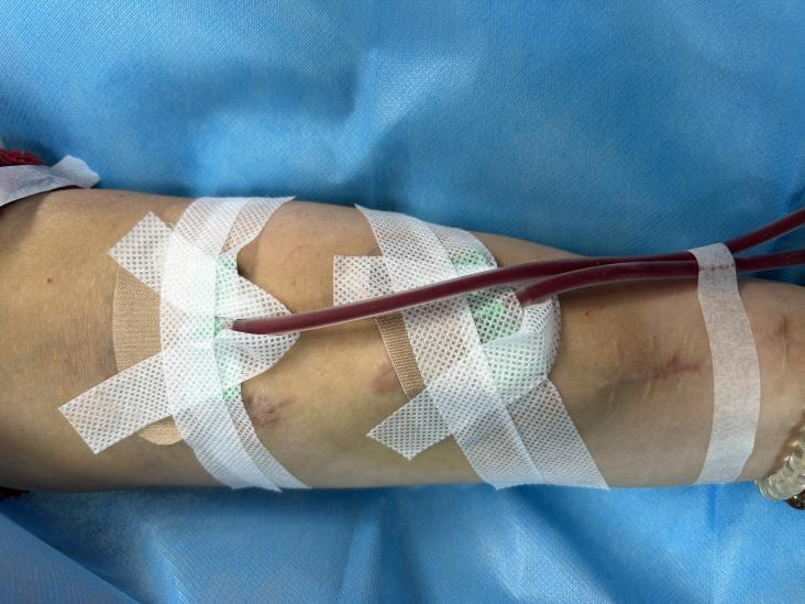 维持性血液透析患者马女士因瘢痕体质,接受锐针穿刺后易形成瘢痕硬化,进而造成血管狭窄,最终导致内瘘闭塞。这已是她第二次建立自体动静脉内瘘,随着每周三次透析穿刺的持续进行,穿刺点逐渐出现硬化增生,血管弹性减弱、压力增大,穿刺难度也随之升高,每次穿刺时马女士都倍感紧张。