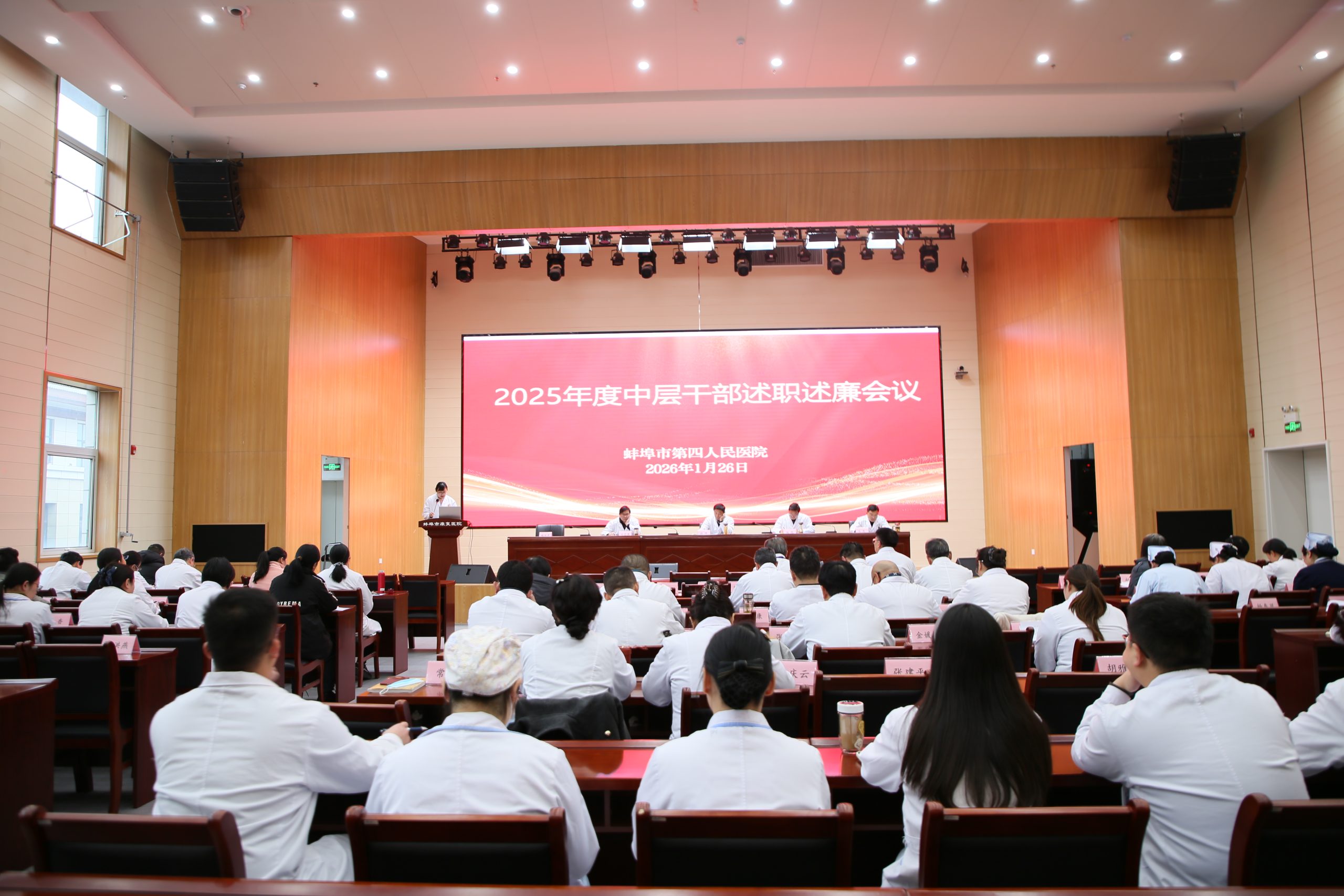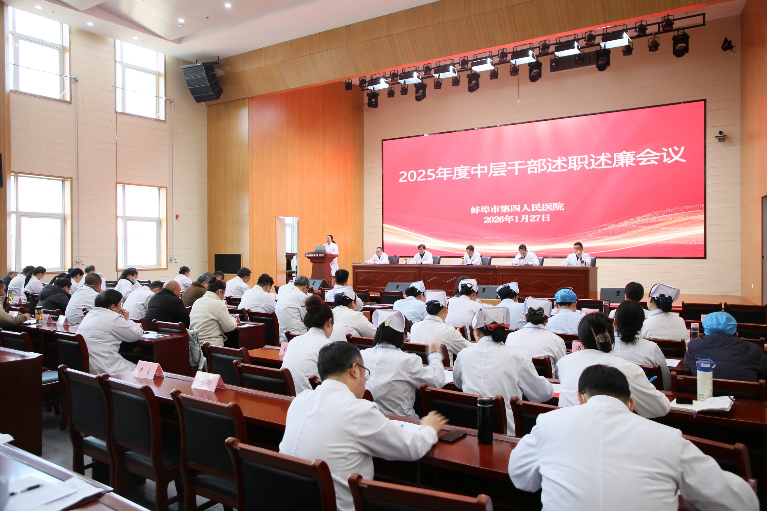 为全面总结2025年度工作成效,进一步加强干部队伍建设,压实履职责任,推动医院高质量发展迈上新台阶,2026年1月26日至27日,蚌埠市第四人民医院(市康复医院)召开2025年度中层干部述职述廉会议。会议全面回顾了2025年工作成果,深入剖析问题不足,科学谋划2026年发展蓝图,积极对接医院“十五五”发展战略布局。医院领导班子成员、职能科室负责人、临床医技科室主任、护士长及职工代表参加会议。会议由党总支副书记、院长施彪主持。
