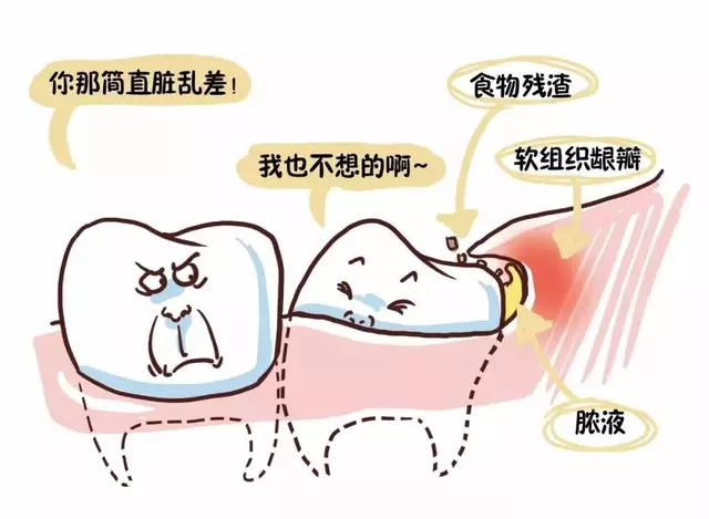 1. 智齿冠周炎:萌出一部分的智齿,而且是阻生齿,智齿牙冠周边软组织与牙齿间形成了盲袋,盲袋内容易积存食物残渣。且不容易刷洗干净,容易发炎,引起智齿冠周炎,甚至更严重的可以引起邻近的间隙感染,骨髓炎等;