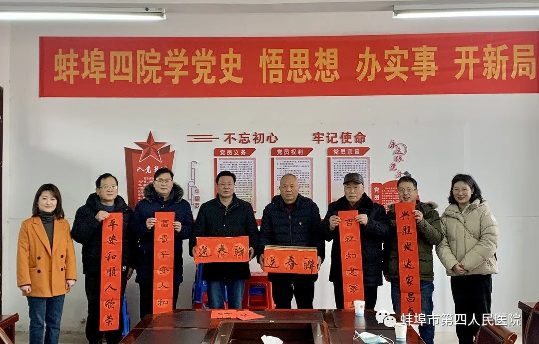 新春祝福送春联,双拥共建暖人心。1月26日,市军休一所党委书记、所长潘炳言,党委副书记吴建明,管委会主任(休干)吴春贵一行来市四院送春联,市四院党总支副书记、院长施彪,副院长付昌满、徐玉林参加活动。