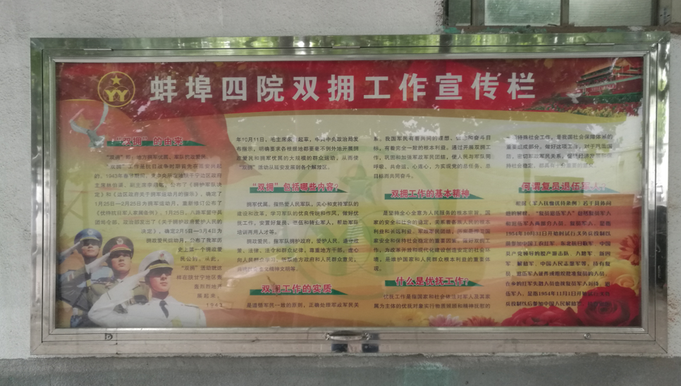 我院积极开展多种形式的宣传教育活动,充分利用微信公众号、网站、宣传栏、电子屏、宣传标语等宣传载体,宣传光荣革命史、英雄模范人物和先进典型,宣传拥军优属、拥政爱民的渊源传承和生动实践,宣传广大退役军人奋发有为的感人事迹,牢固群众的爱国拥军思想,激发群众参与双拥活动的积极性,营造了良好的双拥工作氛围。