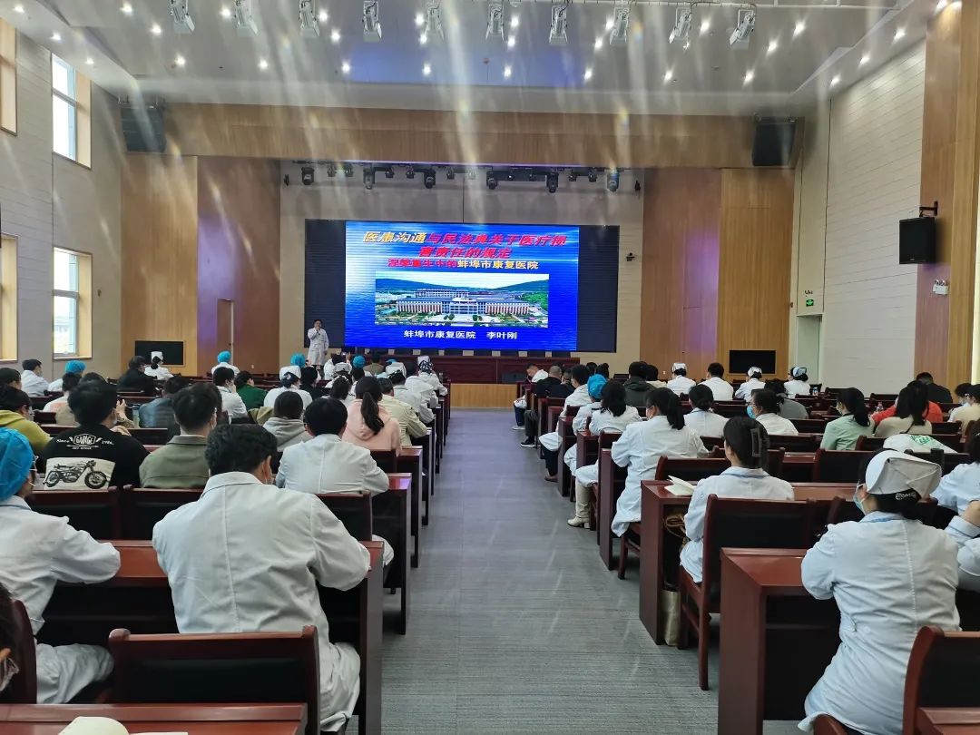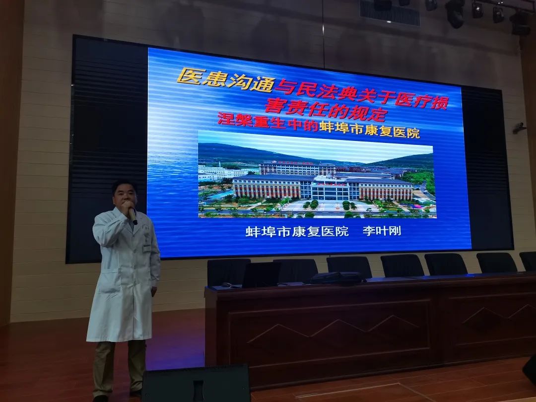 为进一步加强医患沟通,提高医务人员沟通能力,有效防范医疗纠纷的发生,提升患者就医体验。3月22日下午,蚌埠市康复医院(市四院)组织开展“医患沟通与民法典关于医疗损害责任的规定”专题讲座。讲座由李叶刚副院长主讲,院领导班子成员以及全院近300名医技人员参加本次培训。