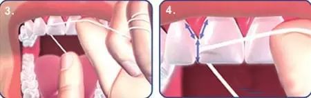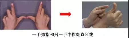 2、两中指间牙线的长度应刚好使拇指伸直接触,用一手拇指和另一手食指绷直牙线;