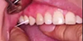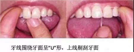 3、清洁上前牙时,将食指伸进口内,拇指在口外绷紧牙线,使牙线紧贴一侧牙面,上下剔刮牙面;