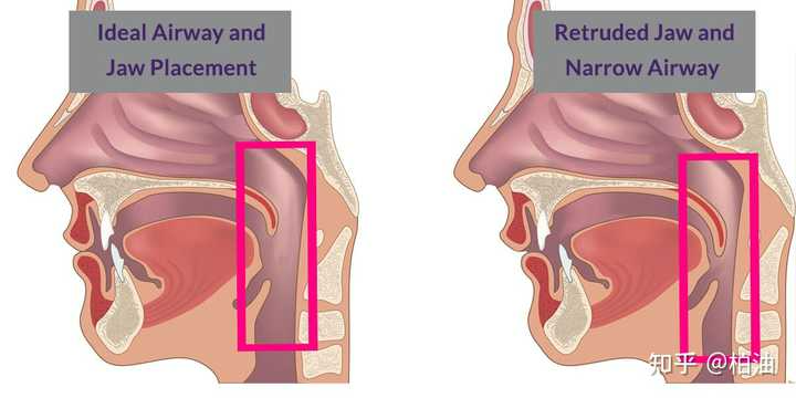 左侧为理想的气道空间,右侧则是狭窄的。低舌位时,舌头向后移动,占据了气道空间。