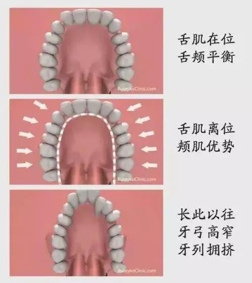 口呼吸伴随低舌位时,舌体与上颚丧失接触,外部颊肌没有与之抗衡的力量,因此挤压上颚变窄、高拱,相应的,上颌牙齿开始拥挤、不齐,最明显的是上前牙前突(龅牙);后牙反颌也会发生。