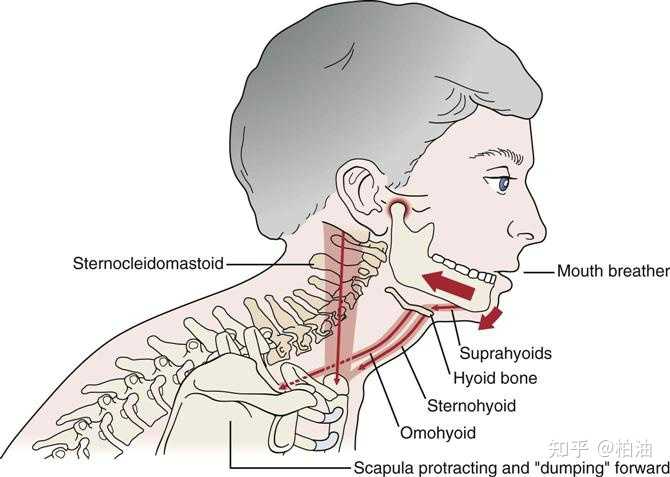 头颈前倾时,下颌骨回缩,舌骨和舌被往下拉