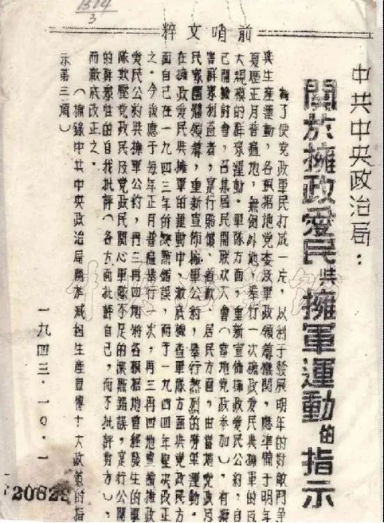 1943年10月1日,中共中央政治局颁布《关于拥政爱民与拥军运动的指示》决定,以后每年的农历正月都要举行一次拥政和拥军的大规模群众运动。