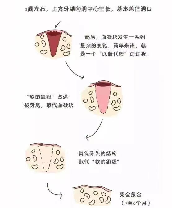 大多数人拔牙后都会关心拔完牙齿后牙床上留下的那个“洞”该怎么办。我们的牙齿都是有牙根的,拔完牙后都会在牙床上留下相应形状的拔牙创口,特别是我们的后槽牙,由于牙齿大、牙根多,拔除后牙形成的拔牙创口相应也会更大一点。不过大家不用担心,随着时间的推移,窝洞会逐渐愈合,而这个愈合的过程需要几个月的时间。拔牙后不同时间段,患者需要注意以下方面: