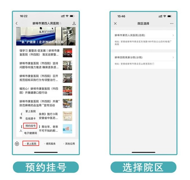打开“蚌埠市第四人民医院”公众号,点击左下角【掌上医院】——【预约挂号】;