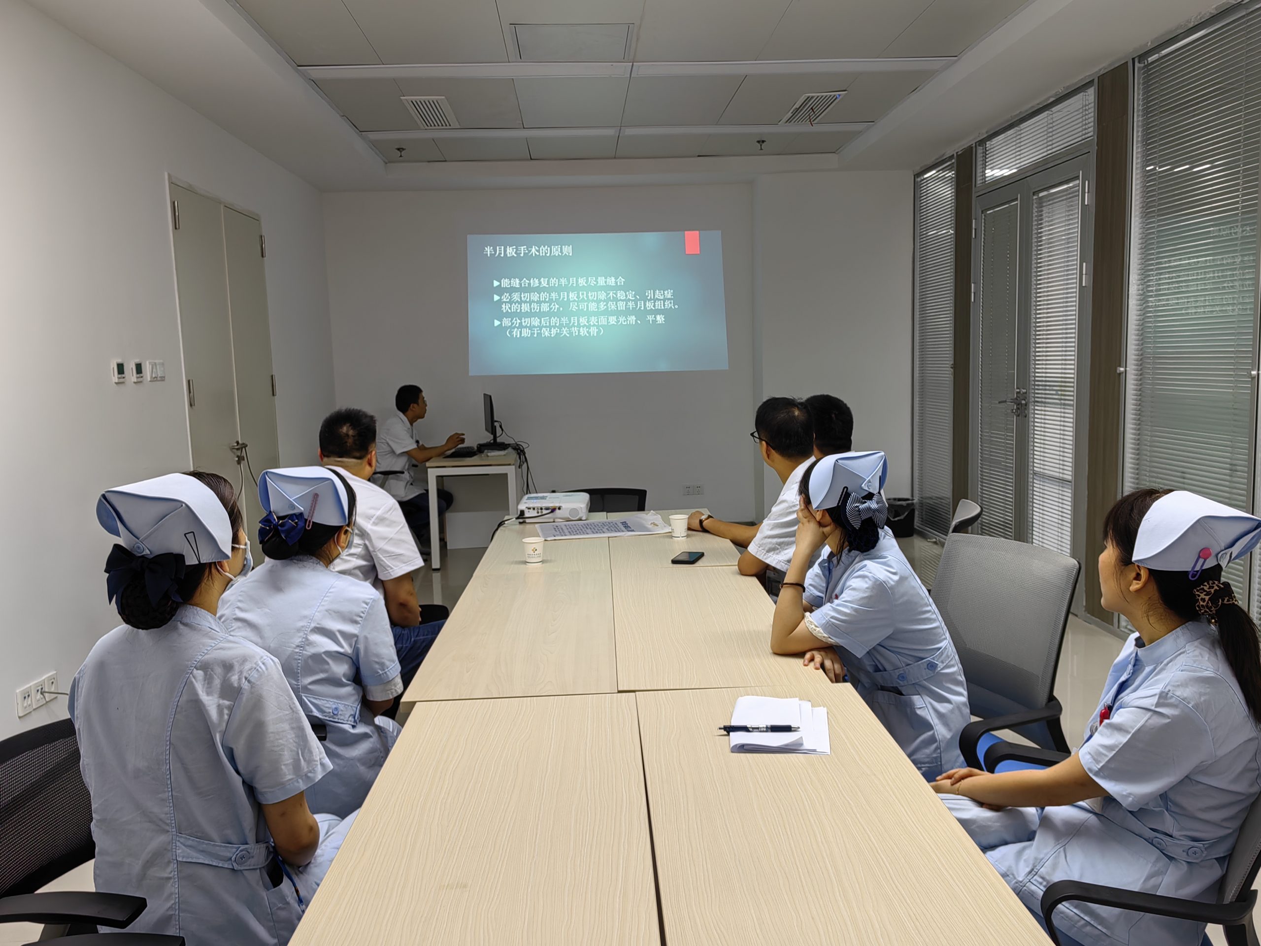 交班结束,科室组织了大查房,护理交班查房。查房结束,处理完日常诊疗,安排好次日手术后,紧接着骨科二组医疗组长李贵同志进行了《常见膝关节病的关节镜手术治疗》业务讲座,以及病例讨论。