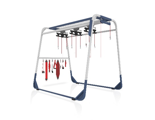 悬吊康复训练器针对骨骼肌肉功能障碍疾患和神经系统疾患的患者,通过单轨滑动悬挂点下连接的相关配件(包括弹性绳、宽带、窄带等),给予患者不稳定支撑面以及弱势肌肉的减重支持,通过闭链运动来进行整体功能评估和治疗(训练),包括激活失活的深层核心肌肉或锻炼失用的外周动作肌肉,达到调整生物力学平衡整体运动链,进而从本质上缓解疼痛以及提高患者的运动功能。