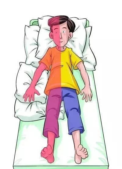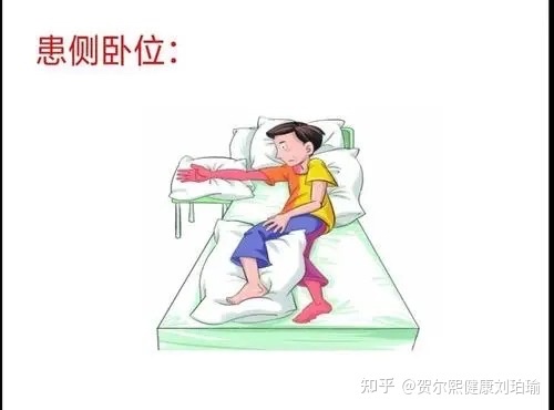 头部枕头不宜过高,面部朝向患侧。患侧肩部垫一个比躯干略高的枕头,将伸展的上肢置于枕上,防止肩胛骨后缩,上肢伸肘,腕背屈,伸指。在患侧臀部及大腿下垫枕,以防止患侧骨盆后缩。枕头外缘卷起可防止髋关节外展、外旋,及支撑膝关节呈轻度屈曲位。