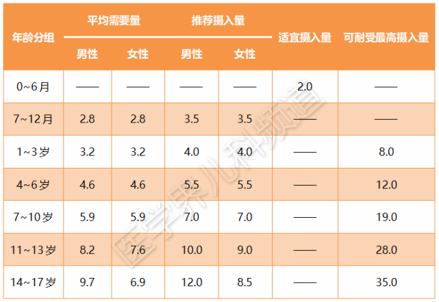 表3.0~17岁儿童及青少年锌元素的膳食参考摄入量(mg/d)
