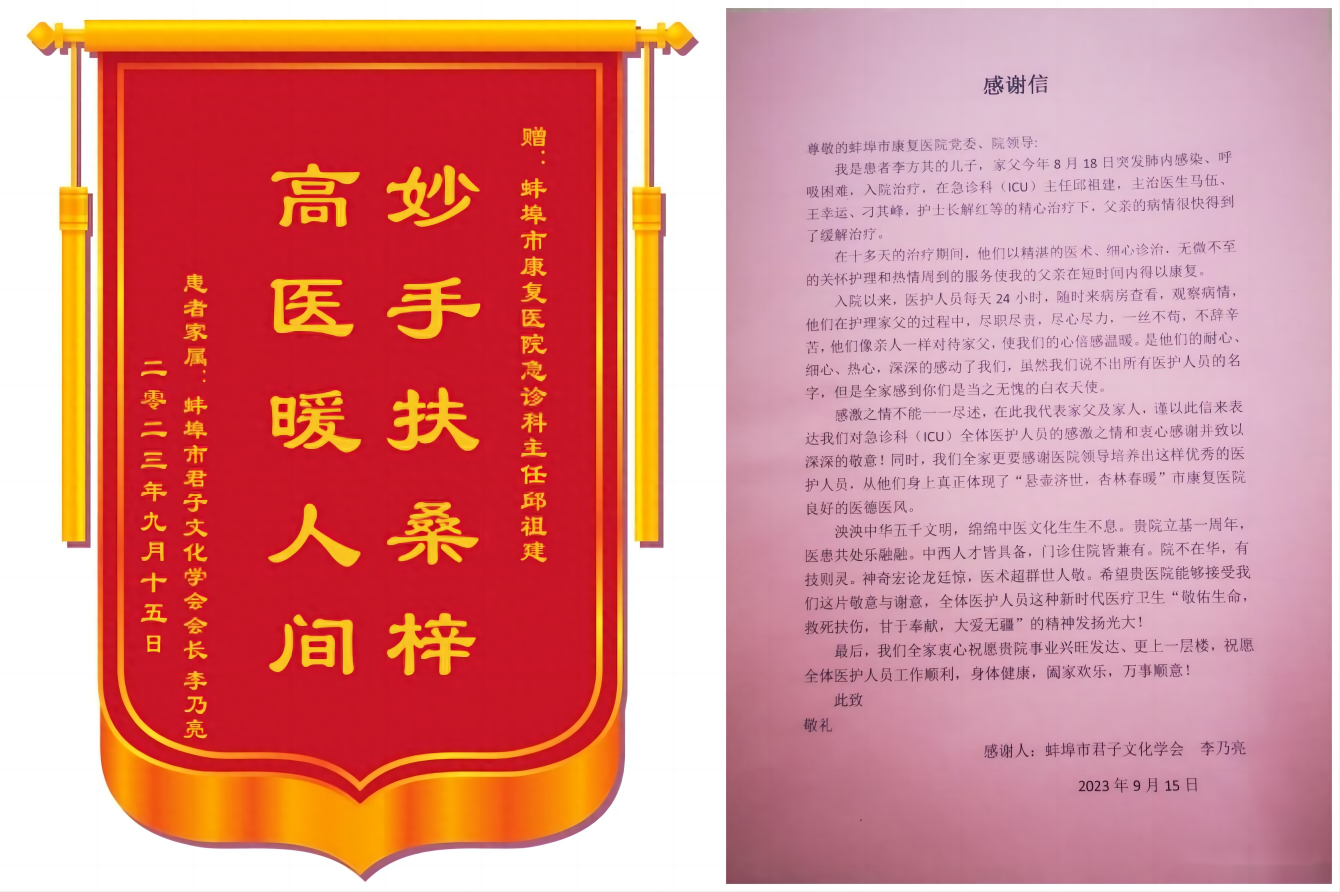 据了解,一个月之前,由于天气突然转凉,已80岁高龄的李大爷突发肺部感染,出现呼吸困难、全身无力等症状,被紧急送入蚌埠市康复医院(市四院)治疗,经急诊科(ICU)邱祖建(主任)医护团队的全力抢救和后续十几天的救治下,李大爷的病情得到及时控制并转危为安,现已康复出院。