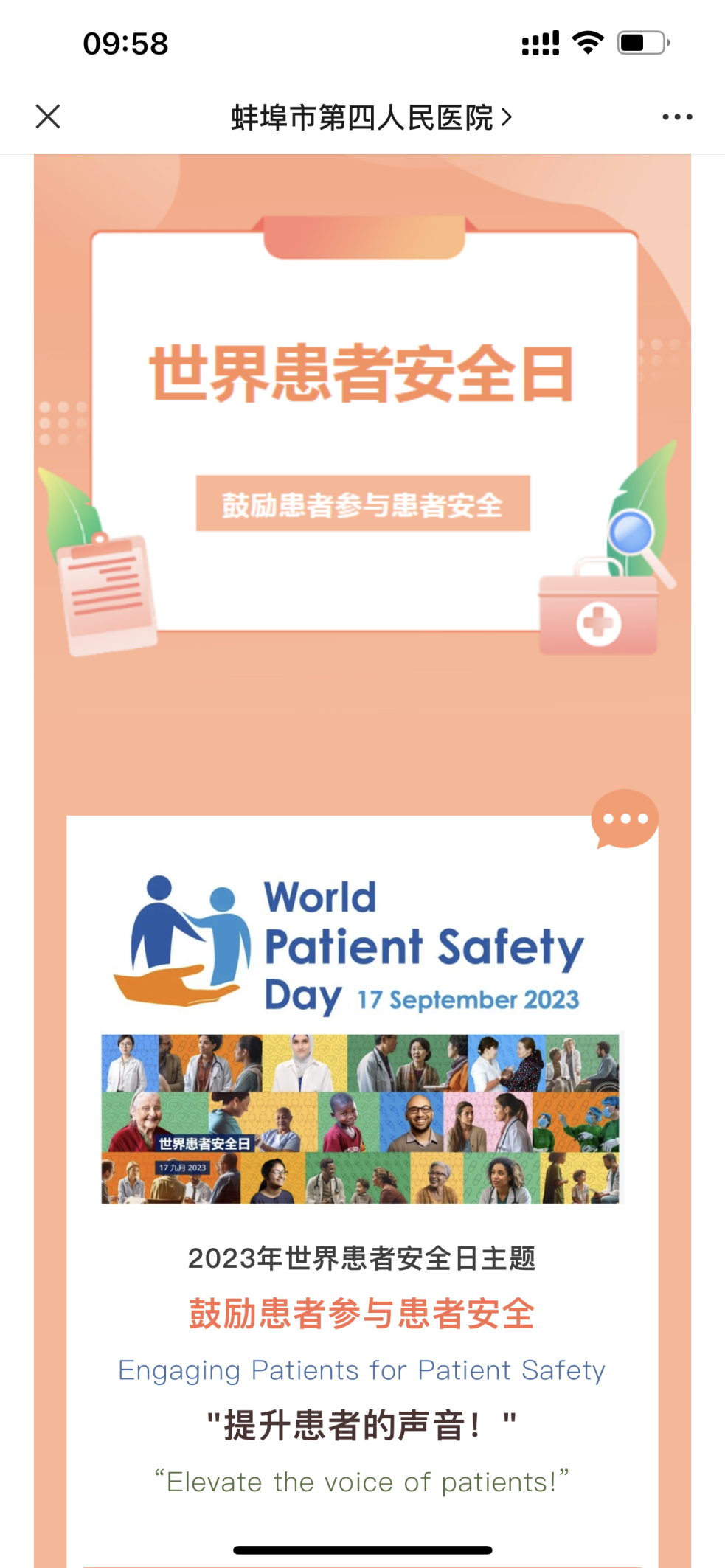 2023年9月17日是世界患者安全日,今年的主题是“鼓励患者参与患者安全”。为进一步增强患者和家庭的参与意识,鼓励引导患者参与自身的护理,保障患者安全,在保障医疗质量安全的同时,构建和谐稳定的医患关系,9月17日,我院组织开展“世界患者安全日”主题系列活动。