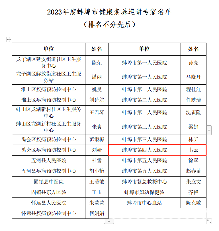 为进一步促进全市健康素养巡讲工作深入开展,提高健康素养巡讲水平,按照省卫健委有关要求,近日,蚌埠市卫健委组织开展市级健康素养巡讲专家遴选,选拔确定了2023年度蚌埠市健康素养巡讲专家人员名单。蚌埠市康复医院(市四院)儿科韦云医生顺利入选。