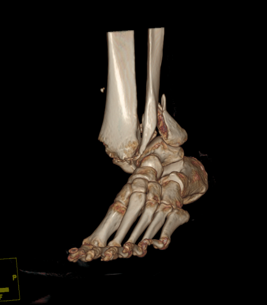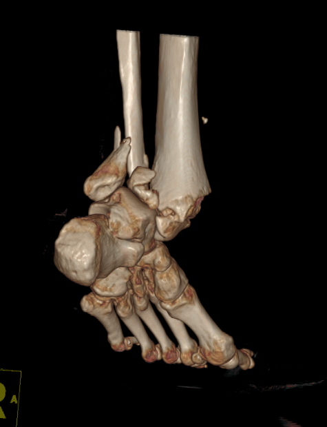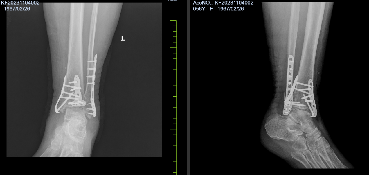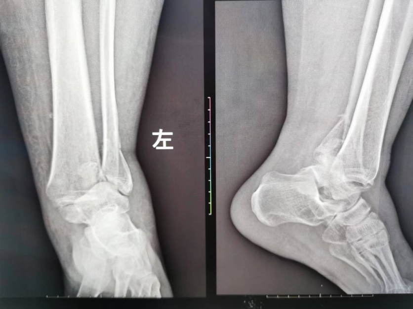 病例五:患者,女,56岁,因“车祸伤致左踝关节肿痛伴活动受限14小时”入院。诊断:左侧三踝粉碎性骨折伴踝关节脱位;行左踝关节骨折切开复位内固定术;手术顺利,术后进行康复训练中,功能恢复良好。