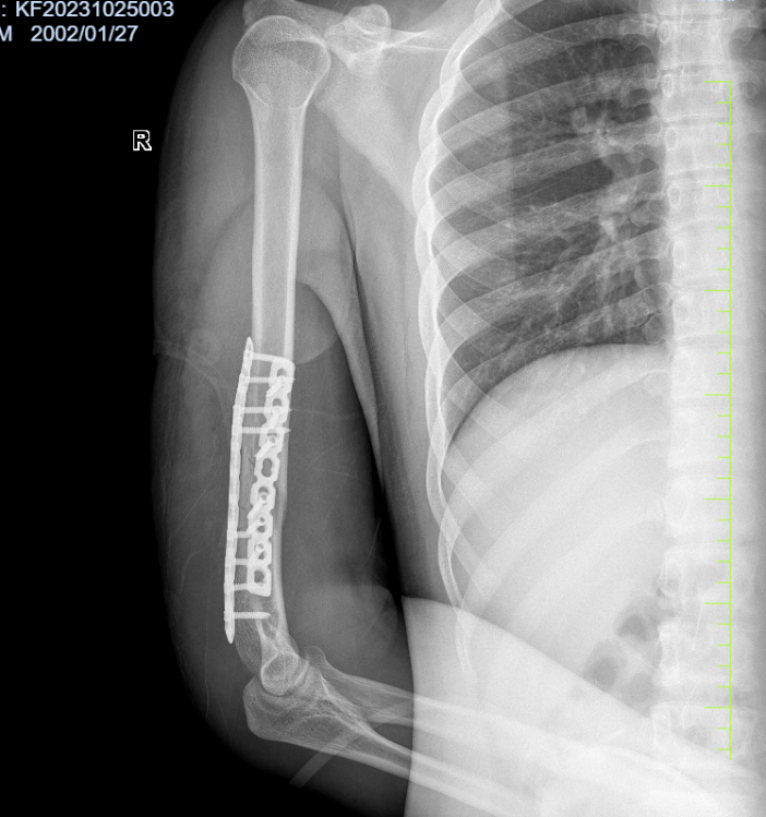 病例四:患者,男,21岁,因“与他人掰腕致右上肢疼痛伴活动受限5小时”入院。诊断:右肱骨干粉碎性骨折,桡神经损伤;行右肱骨干骨折切开复位内固定+桡神经探查修复术;手术顺利,术后进行康复训练中,功能恢复良好。