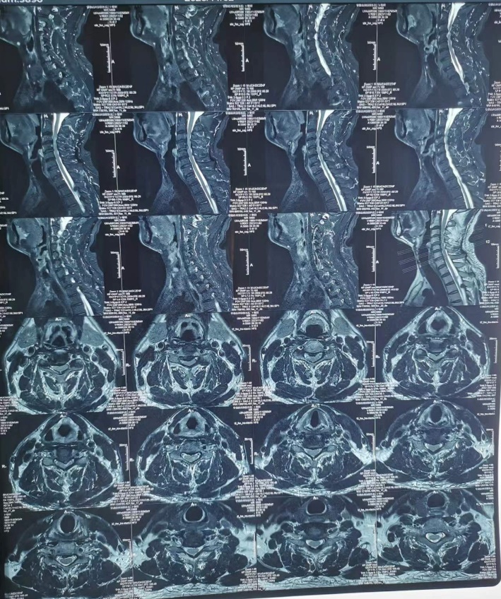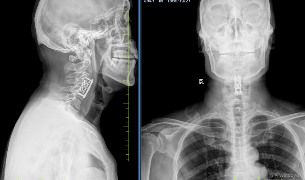 病例八:患者,男,54岁,因“颈肩部酸痛不适半年,伴左下肢行走不稳2月余”入院。诊断:脊髓型颈椎病;行颈4椎体次全切+椎管减压融合内固定术(ACCF)。手术顺利,术后进行康复训练中,功能恢复良好。