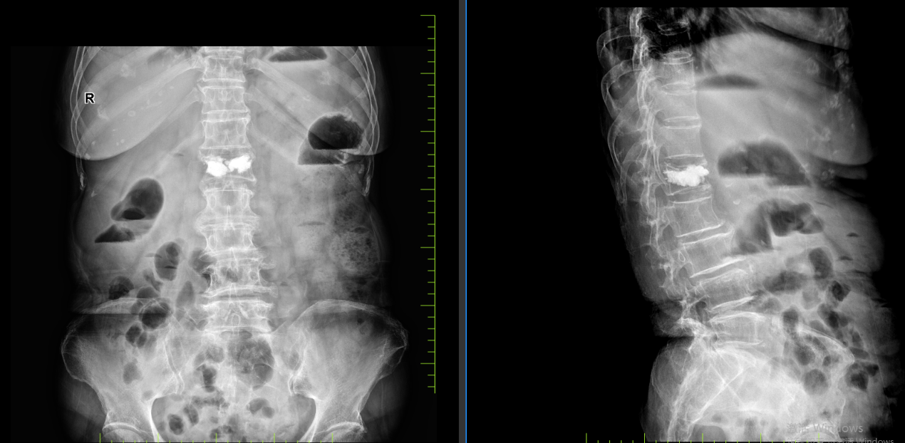病例三:患者,刘某,女,72岁,因“外伤致腰部及髋部疼痛不适1天”入院。诊断:腰1椎体压缩性骨折,骨质疏松症;行经皮穿刺腰1椎体成形术,手术顺利,术后恢复良好,顺利出院。