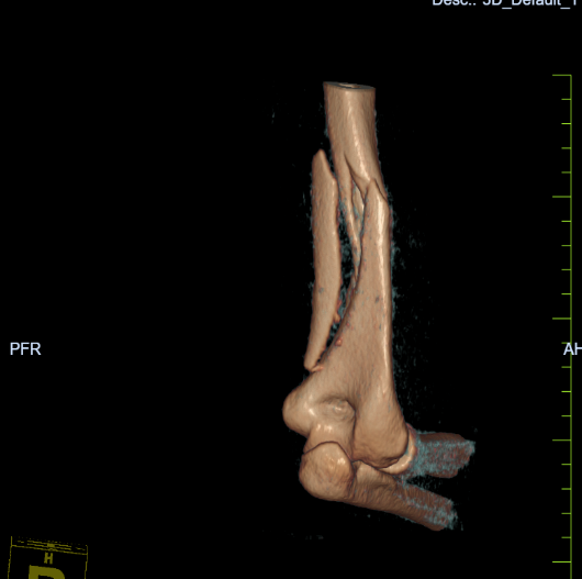 右肱骨干粉碎性骨折 术前X线片 右肱骨干粉碎性骨折 术前三维CT