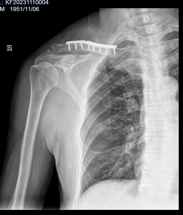 病例六:患者,男,71岁,因“摔伤致右肩部疼痛伴活动受限1小时余”入院。诊断:右锁骨骨折;行右锁骨骨折切开复位内固定术;手术顺利,术后恢复良好,顺利出院。