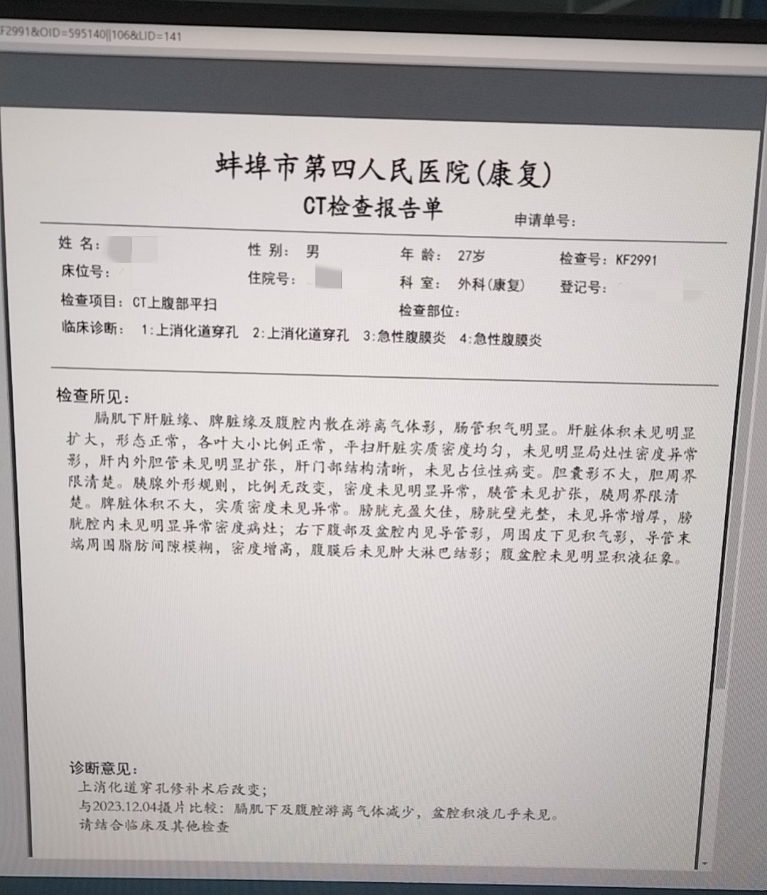 2023年12月4日晚上10时许,蚌埠市第四人民医院(市康复医院)急诊外科诊室进来一名患者,“医生,肚子突然痛的受不了”、“疼痛有2小时了”、“快点救救我”。急诊外科值班支永成主治医师立即上前,凭借丰富的临床经验,通过查体初步诊断:上消化道穿孔。立即行立位腹部平片+腹部CT检查提示:膈下游离气体,考虑上消化道穿孔。随后立即办理入院,在医院总值班石法荣主任协调下,功能科袁伟主任完善各项术前检查,同时麻醉科张建平主任及手术室护理团队在手术室立即做好了准备,随时准备手术。