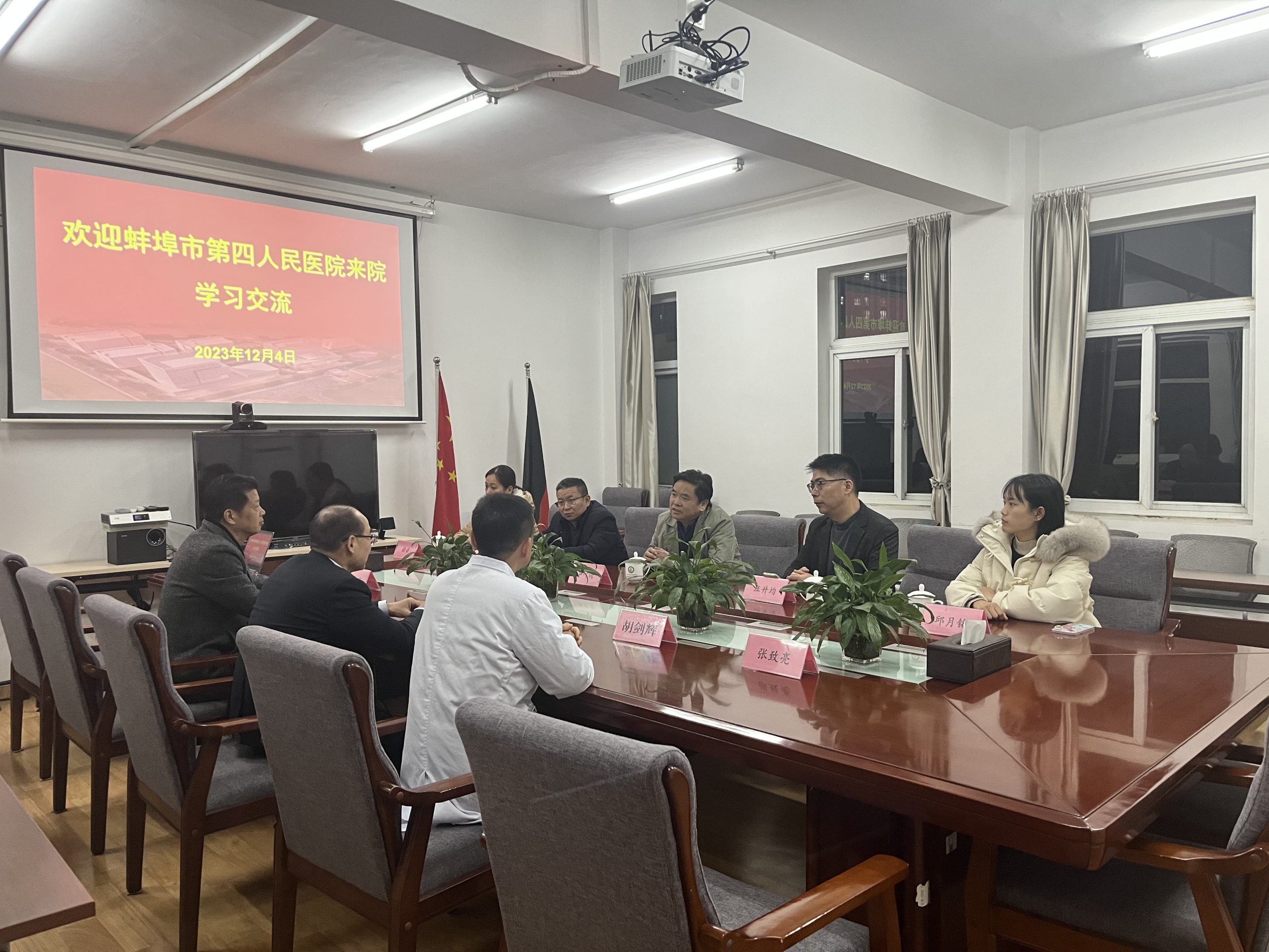 为进一步提高我院康复医疗服务水平,捋顺转型后综合医疗与康复医疗关系,促进我院康复事业和转型升级和谐健康发展。近日,蚌埠市第四人民医院(市康复医院)副院长李叶刚、康复治疗部主任汪升均一行5人前往安徽省皖南康复医院(五院)进行了短期培训交流。安徽省皖南康复医院(五院)党委书记林丙来、副院长施志农、副院长胡剑辉及科教部、康复部负责人热情接待。