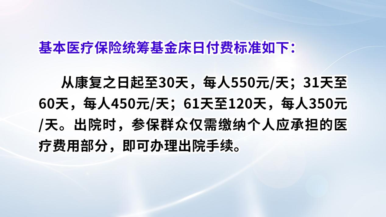 基本医疗保险统筹基金床日付费标准如下:从康复之日起至30天,每人550元/天;31天至60天,每人450元/天;61天至120天,每人350元/天。