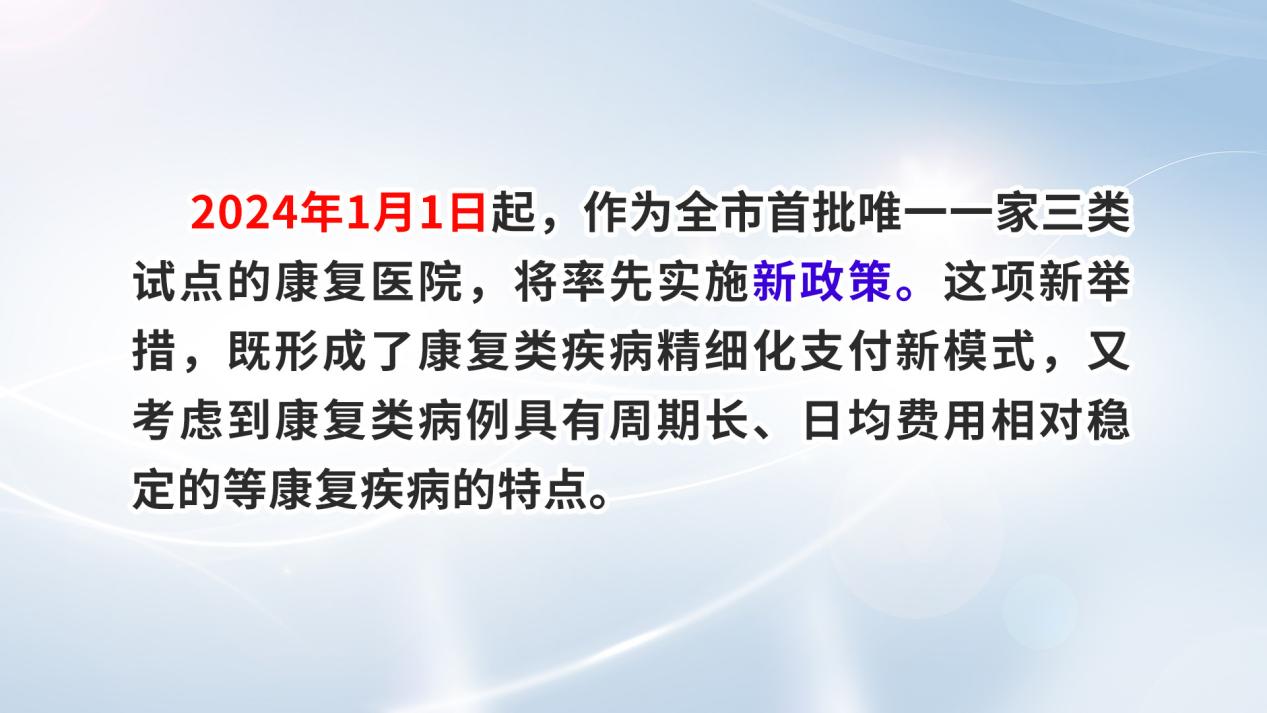 为切实保障参保群众基本康复医疗需求,有效控制康复医疗费用不合理增长,不断提高医保基金使用效率,促进我市康复医疗有序健康发展,市医保局主动探索开展康复类疾病住院按床日付费,将医保支付方式改革向纵深推进,初步形成以病种(DRG)为主多元复合式医保支付方式机制体制。作为全市首批唯一一家三类试点的康复医院,2024年1月1日起,蚌埠市康复医院(市四院)将率先实施新政策。