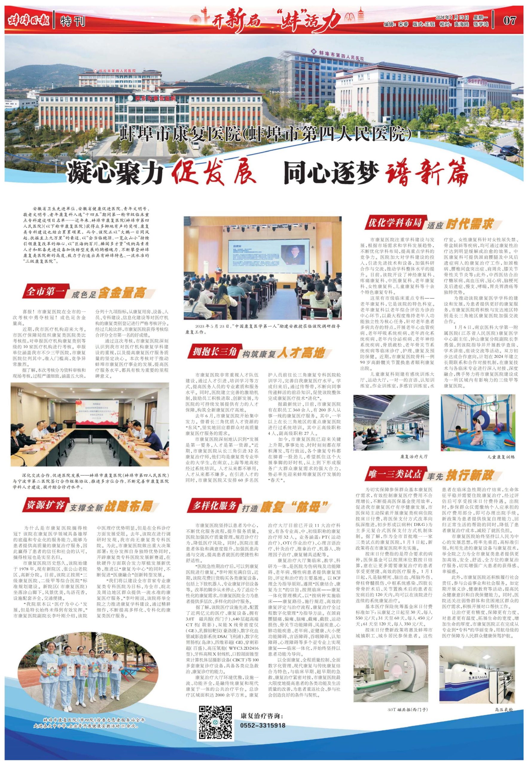“我们将以建设全市首家专业康复类专科医院为目标,为全市、皖北及周边地区的群众提供一流水准的康复医疗服务。”李叶刚说,该院将举全院之力推进康复医疗的建设,通过精耕细作,不断提高多样化、专科化的康复类医疗服务。